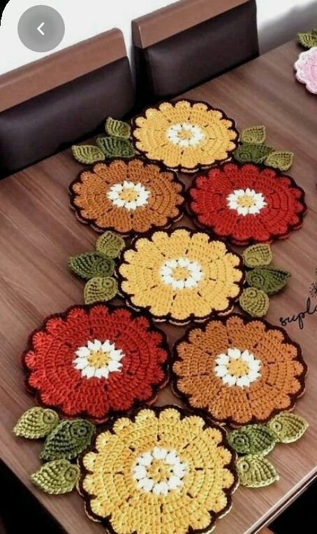 * Design: Features a series of five individual, colorful crochet flower motifs arranged linearly to form a table runner. Each flower has a central white element, layered petals in shades of yellow, brown, and red, and a dark brown scalloped border. Green crochet leaves are attached between each flower along the sides.