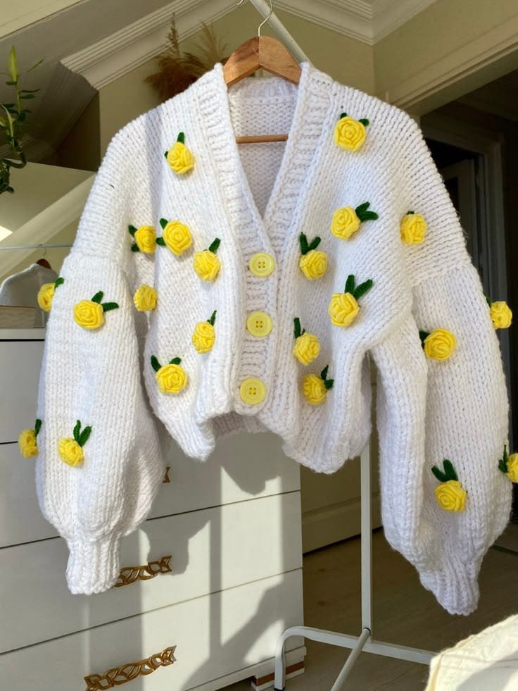 Wrap yourself in cozy elegance with our Rose Bloom Crochet Cardigan, a handcrafted masterpiece designed to bring warmth and charm to your everyday style. Each cardigan features beautifully detailed 3D crochet roses with delicate green leaves, adding a playful yet romantic touch to its chunky knit texture.